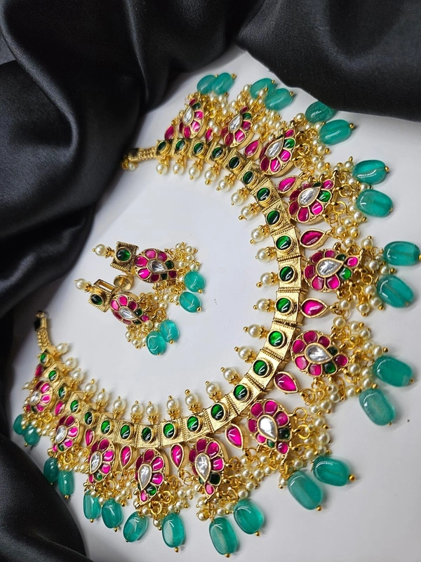 elegant jadu kundan sleek necklance with pearl and bead drop